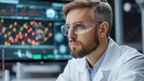Multi-screen setup displaying complex graphs being optimized in real-time, data scientist in a high-tech lab environment