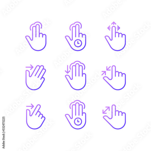 Multitouch gestures gradient linear vector icons set. Touchscreen control. Tablet and phone navigation. Thin line contour symbol designs bundle. Isolated outline illustrations collection