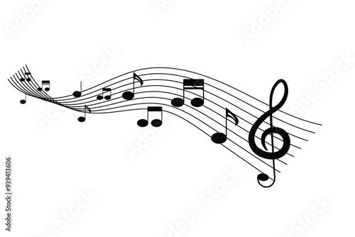 Music notes wave. Music notes background. Musical notes melody on white background. Flowing music notes on wave sheet with clef. Musical background with circle frame, vector illustration.