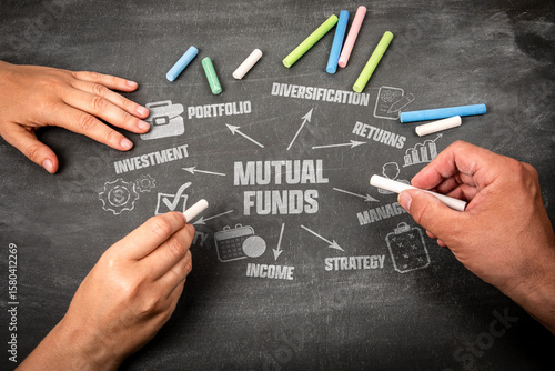 Mutual Funds Concept. Illustration with icons, arrows and keywords on a black chalkboard background