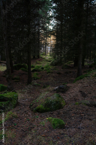 Mysterious dark forest, Iceland. Moss on stones, silhouettes of trees.
