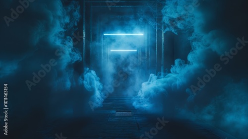 Mysterious Doorway in Blue Fog with Neon Lights Creating an Eerie Atmosphere