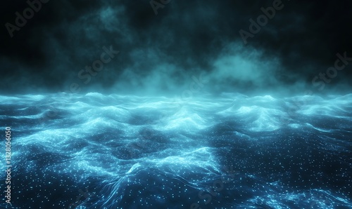Mysterious glowing ocean waves under a dark, cloudy sky.