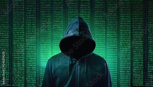 Mysterious hooded figure standing before a digital binary code background, representing cyber security, hacking, and digital crime concepts