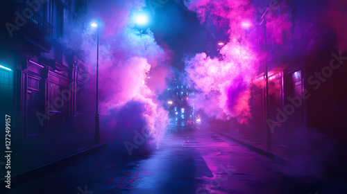 Mystic multi colored smoke moving over wet asphalt. city street with an atmosphere of horror at night. Mystical Neon Landscapes. Illustration