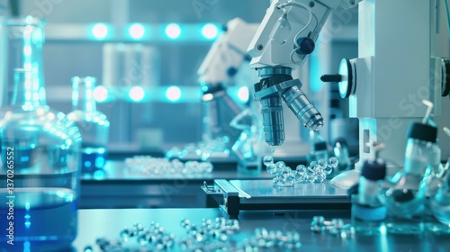 Nanotechnology Lab: Microscopic Robots Assembling Structures Under Microscope Inspection