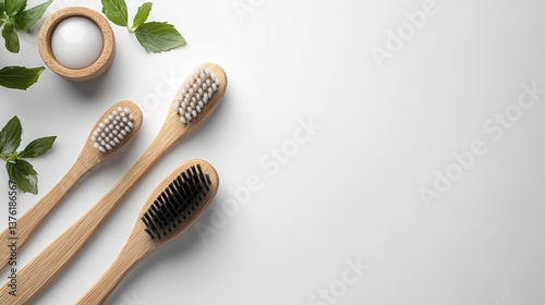 Natural Bamboo Toothbrushes & Mint on White Surface