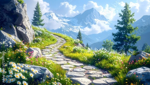 Natural stone path in meadow high resolution photo