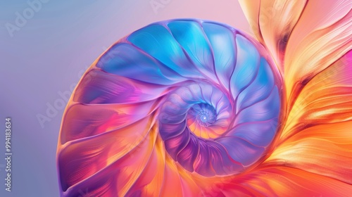 Nautilus shell highlighted in an abstract setting, showcasing its detailed spiral. The shell's geometric design is a beautiful display of marine life and nature.