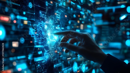 Navigating the Digital Cosmos: A close-up of a hand interacting with an intricate, futuristic digital interface, pulsing with glowing energy, symbolizing advanced technology and innovation.