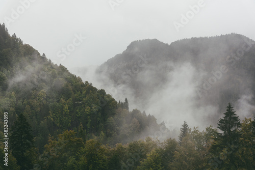 Nebel hängt in den Wäldern