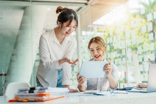 Negotiation, Analysis, Discussion, Portrait of an Asian women economist and marketer using tablet computer to plan investments and financial to prevent risks and losses for the company