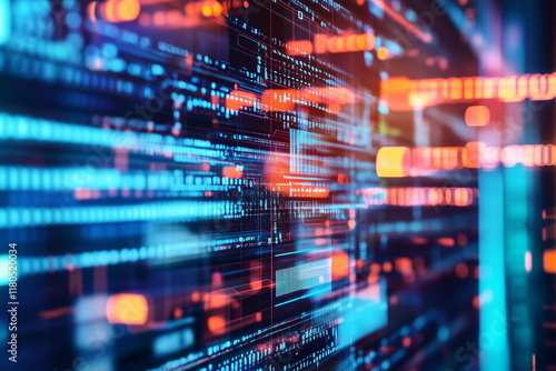 Neon blue and orange geometric abstract background. Digital data or computer microchip