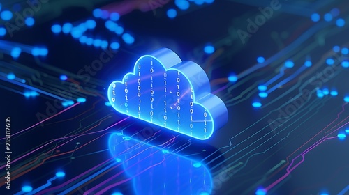 Neon blue cloud computing symbol on a circuit board representing modern technology and data storage solutions.
