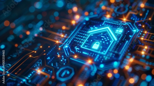 Neon blue house icon with a padlock on a circuit board with orange glowing lights. AI generative. .