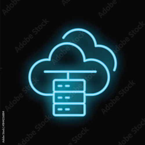 Neon blue icon of cloud computing connecting to server database glowing on black background