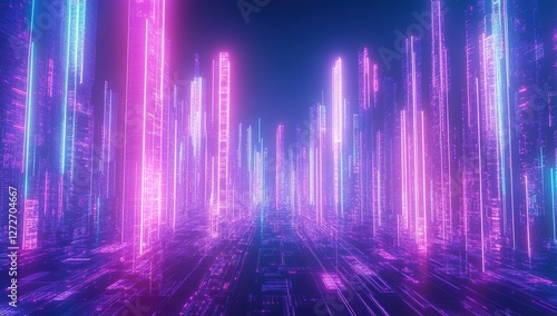 Neon Cityscape: Futuristic Digital Towers Glow Brightly in a Cyberpunk Nightscape, Illuminated by Vibrant Hues
