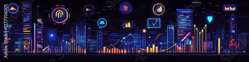 Neon Cityscape Illustrating Technological Growth and Data Analysis