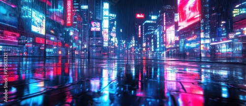 Neon Cityscape Reflection in Rainy Night - Urban Street Photography