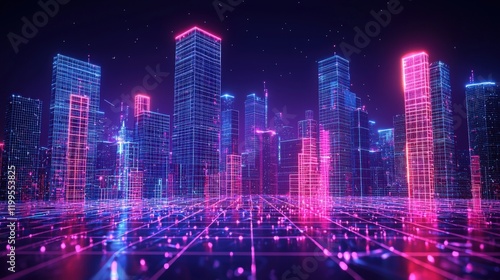 Neon Cityscape with Grid Floor, Glowing Buildings, Night Sky, Generated AI