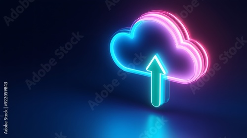 Neon cloud icon with upload arrow, glowing in blue and pink tones, representing cloud computing, storage, and data synchronization.