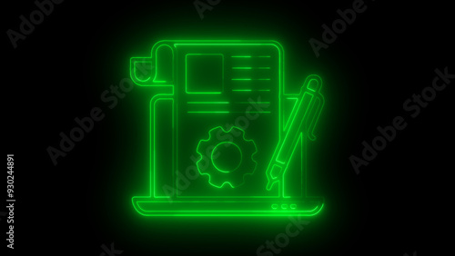 Neon Digital Document Management Icon with Gear and Pen, High-Tech Document Interface, Online Document Workflow.