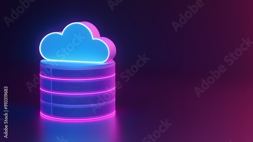 Neon glow cloud computing data storage concept on a dark background. Futuristic digital technology, server, and internet connectivity.