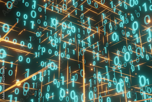 Neon glowing binary number zero and one in an invisible cube outlined by partial orange lines. Illustration of the concept of computing, networking, electronics and artificial intelligence