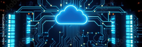 Neon glowing cloud symbol with digital circuit pattern background, SAP technology, Cloud computing