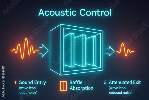 Neon Infographic of Acoustic Sound Baffle for Noise Reduction and Absorption in Industrial Spaces