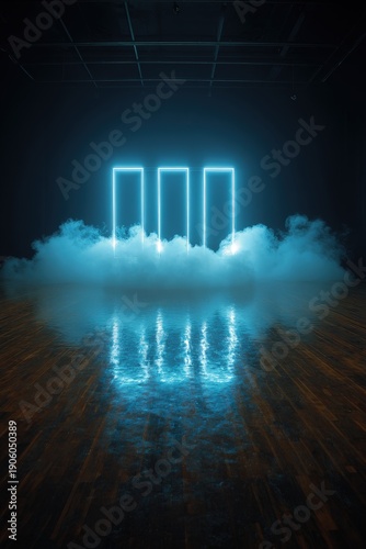 Neon Light Installation In Dark Room With Reflection