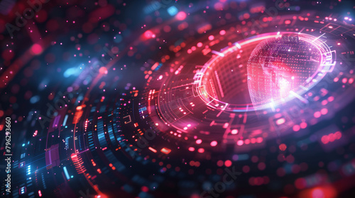 Neon, lights and futuristic and connection board, cyber and circuit in 3d, softwear for programming. Network, information technology and sever in digital computing, cybersecurity and electronic