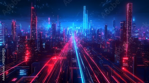 Neon lights illuminate a futuristic city.