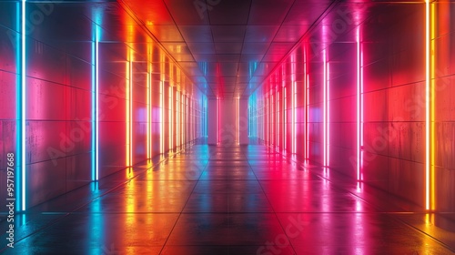 Neon Lights Illuminating a Long, Empty Corridor