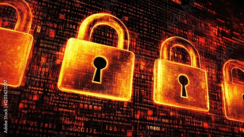 Neon padlocks and binary code hovering over a tech-inspired abstract background.