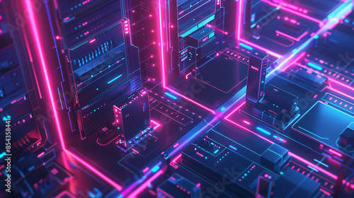 Neon pink and blue glowing circuit board with copy space text, for technology, design, and futuristic