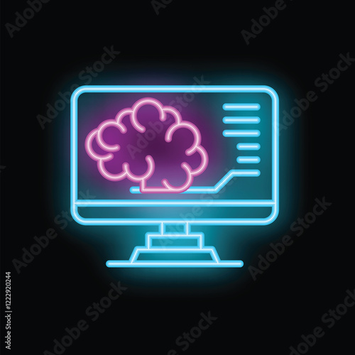 Neon sign showing a desktop computer with a human brain displayed on the screen and data points, representing artificial intelligence