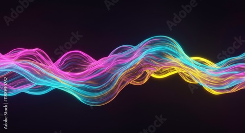 Neon Wave Abstract: Vibrant, flowing ribbons of neon pink, blue, and yellow light dance across a dark background, creating a mesmerizing and dynamic abstract artwork. Perfect for technology, music.