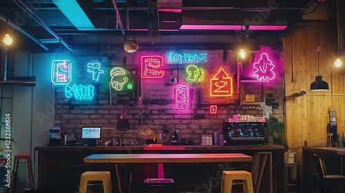 Neon-lit cafe bar interior, vibrant wall, city backdrop