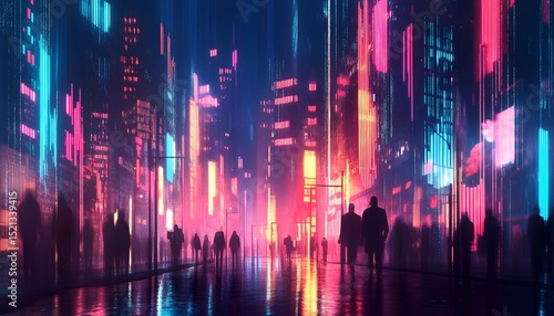 Neon-lit city street at night with people walking.