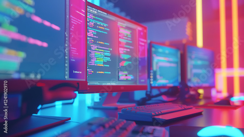 Neon-lit Coder's Workstation with Multiple Monitors Displaying Code
