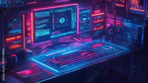 Neon-lit tech workspace with multiple screens displaying data and code.