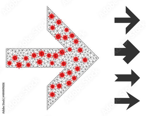 Net arrow right in infection style. Polygonal wireframe arrow right image in low poly style with combined linear items and red infection elements.