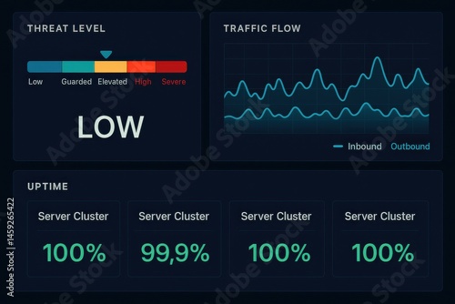 Network administration and monitoring support data center concept. Monitoring system displaying low threat level and server uptime metrics.