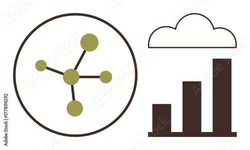 Network diagram with interconnected nodes, bar chart with ascending bars, and cloud icon. Ideal for analytics, data science, technology, networking, cloud computing statistics minimalism. Simple