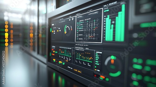 Network Engineer Cloud Server VM Digital control panel displaying VM load balancing, set near cloud servers, 3D illustration