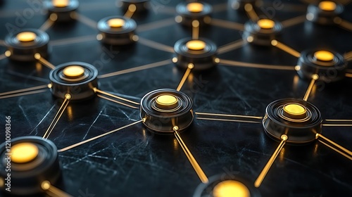 Network Nodes: Glowing nodes interconnected by a complex web, representing digital connectivity, data flow, or neural networks. A futuristic and abstract image.