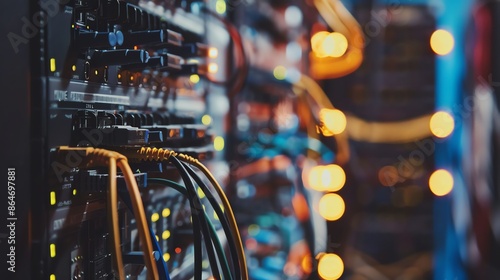 Network server equipment in data center. Concept of big data, cloud computing, hosting, internet and technology.