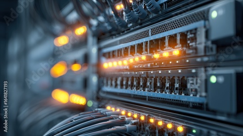 Network Server Rack with Cables and Lights: Data Center Equipment for Connectivity and Processing