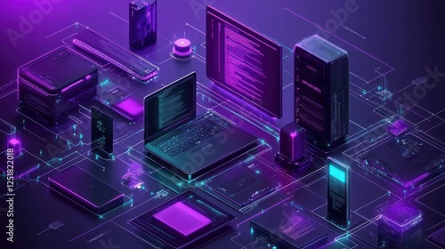 Networked devices, digital workspace, futuristic tech, server room, data flow, software development
